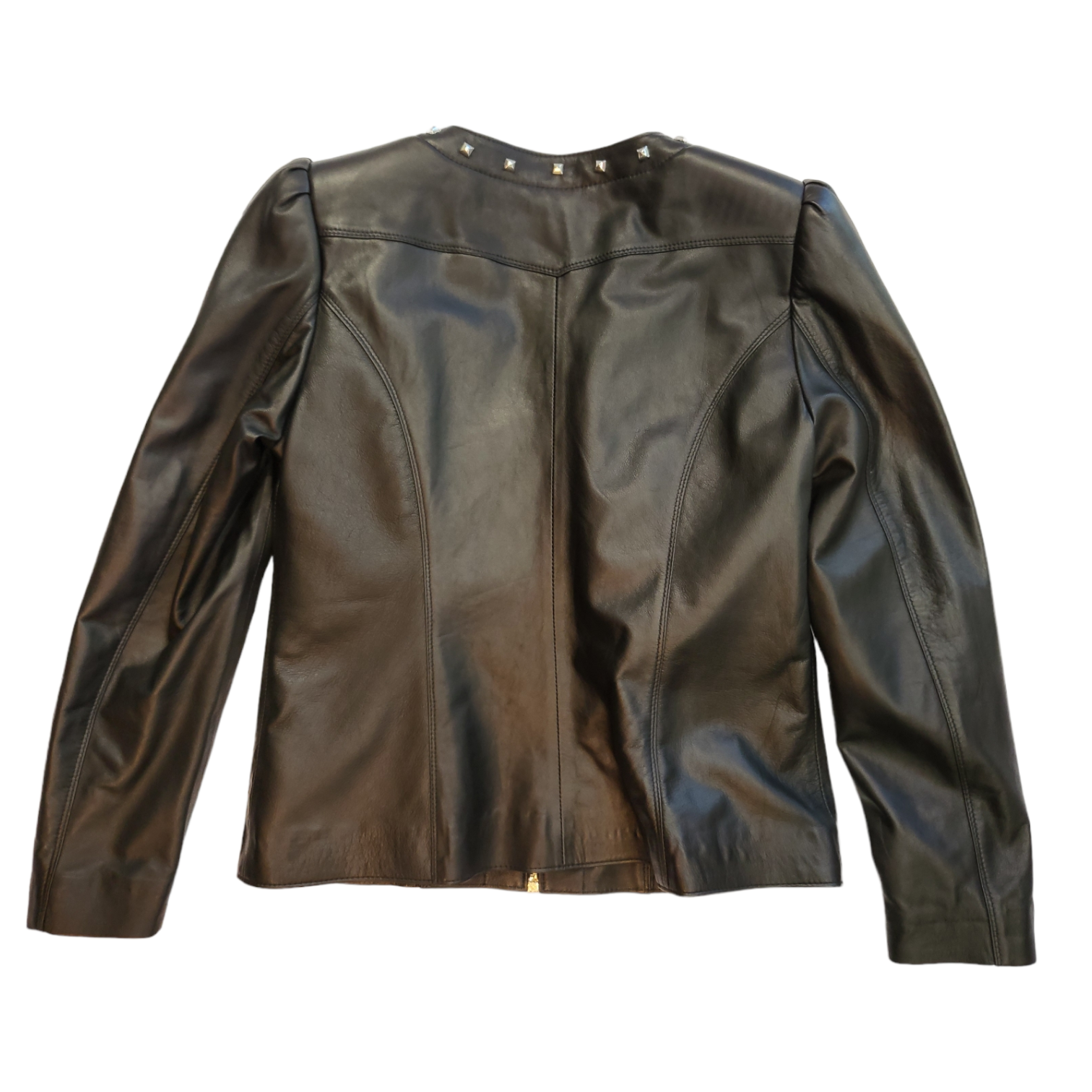 Chaqueta de piel auténtica color negro con tachuelas, de cremallera, con bolsillos de cremallera.